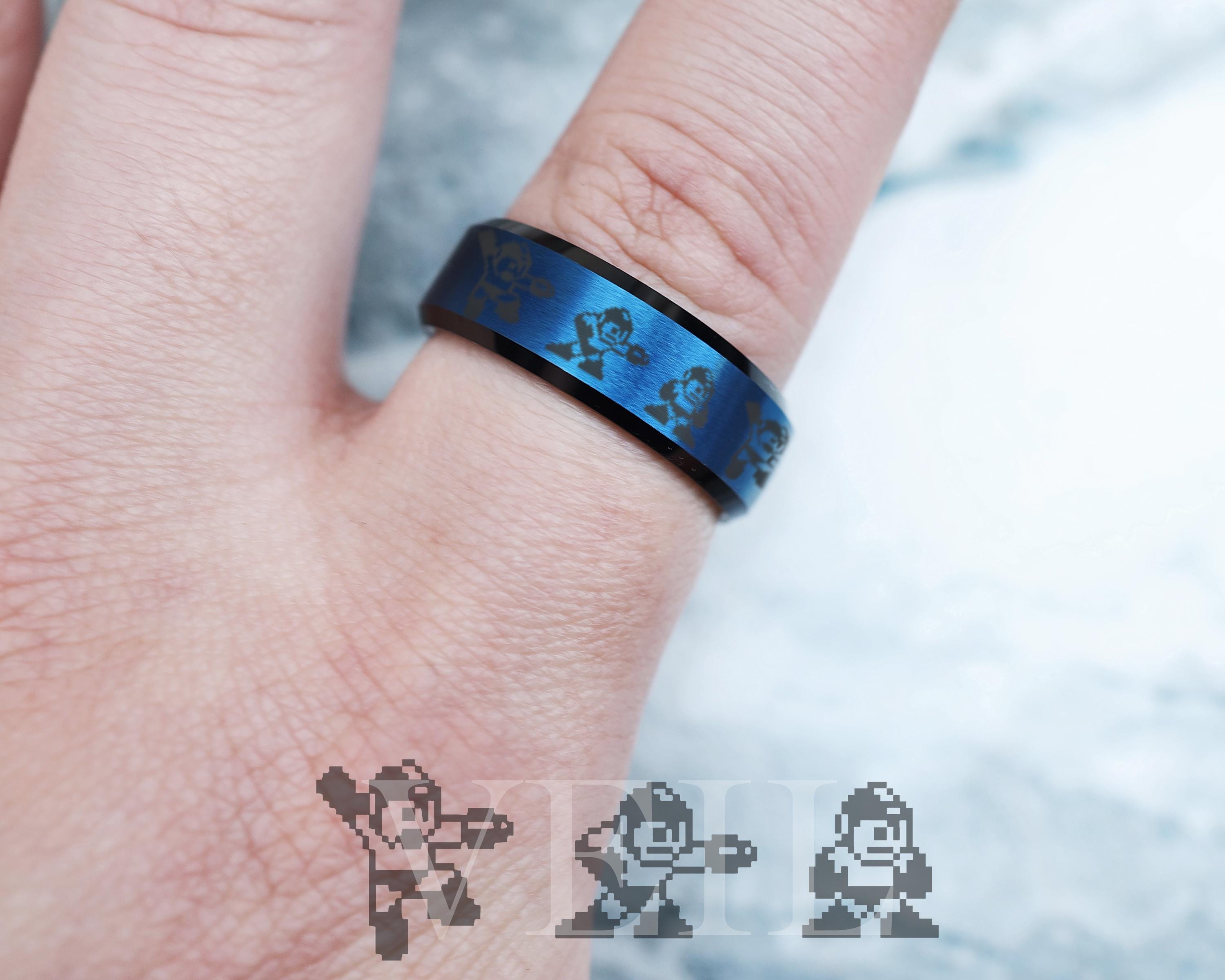 Blue Tungsten Ring: Retro Mega Man Wedding Ring, Mega Man Ring, Mega Man Promise Ring - 8mm