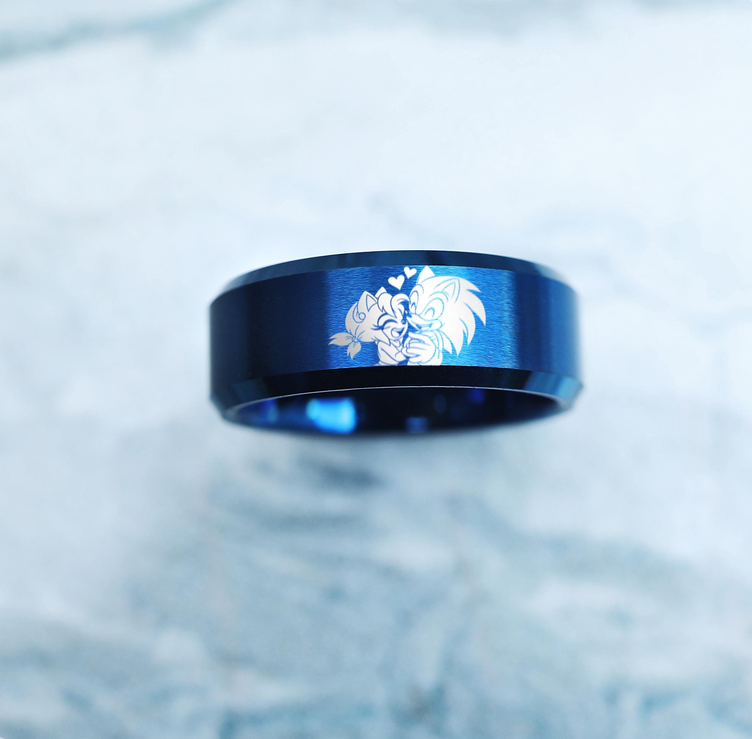 This bold 8mm blue tungsten ring features a sleek Sonic and Amy Rose inspired engraving, making it a standout piece for gamers and collectors alike. Crafted from durable tungsten carbide, it combines strength and comfort, perfect as a wedding band or everyday statement ring. A unique gift idea for fans, this ring merges style, fandom, and durability in one unforgettable design.