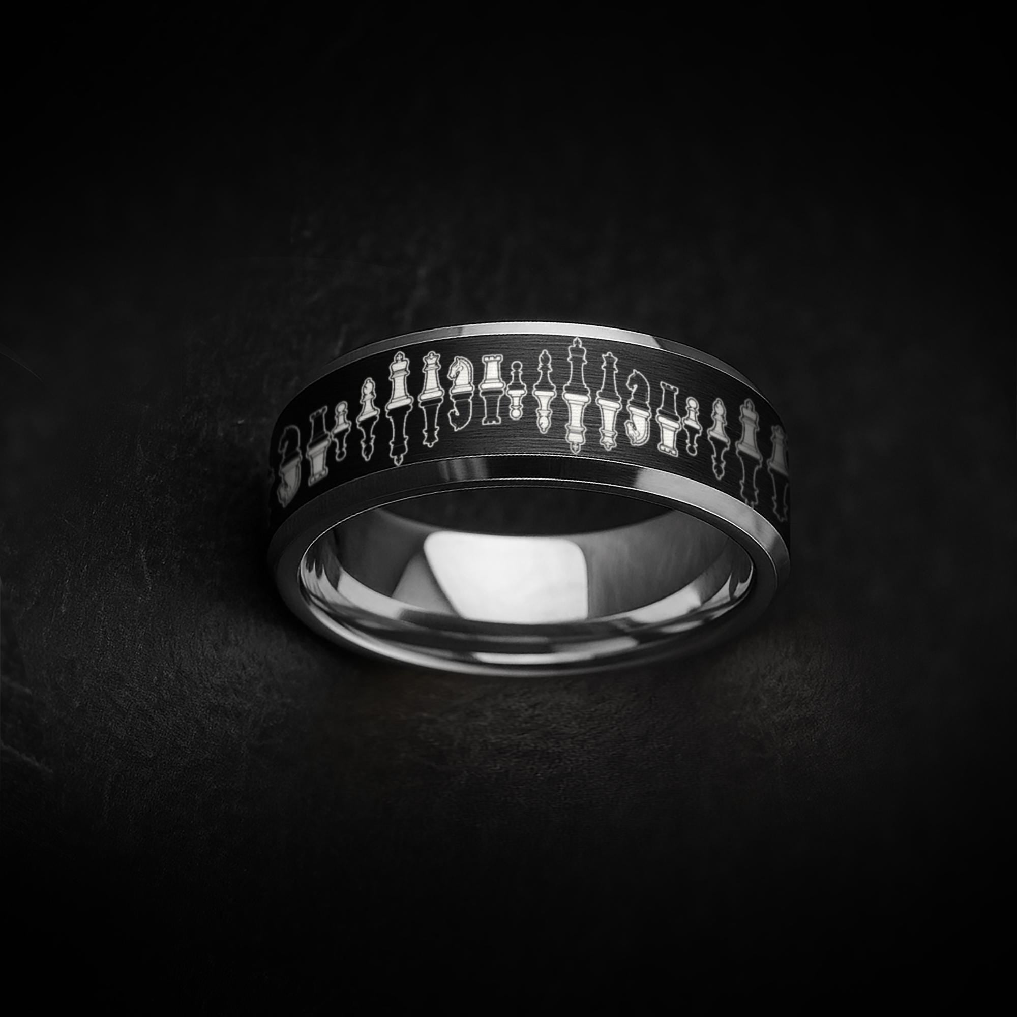 Chess Engraved Men’s Wedding Band | Black Tungsten Chess Ring | Strategy Game Ring for Him | Unique Mens Band | Chess Lover Gift - 8mm Wide