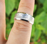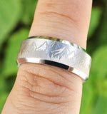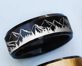 This is a beautiful mens (or womens) mountain and forest design ring. This is the perfect ring for anyone that appreciates the mountain and forest outdoors; beautiful, simple and elegant. This is the light engraved version, which is perfect for anyone that wants a beautiful subtle design. On all color options, the engraving will be light silver in color.