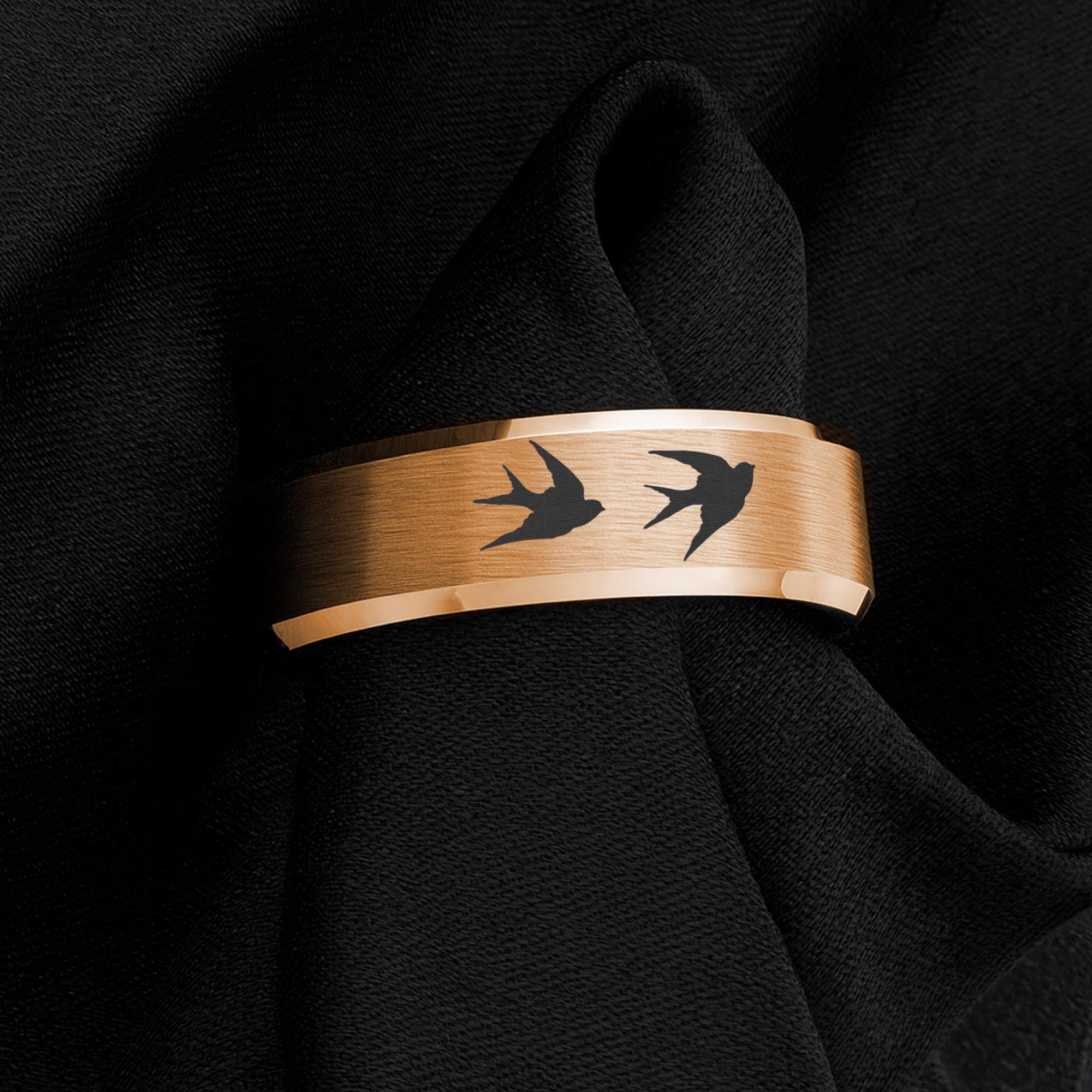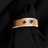 This tungsten carbide ring features engraved swallows in flight, symbolizing freedom, love, and safe journeys. The brushed rose gold finish with polished beveled edges gives it a modern yet timeless design. Scratch-resistant and durable, it’s a meaningful choice for wedding bands, anniversary gifts, or everyday jewelry for bird and nature lovers.