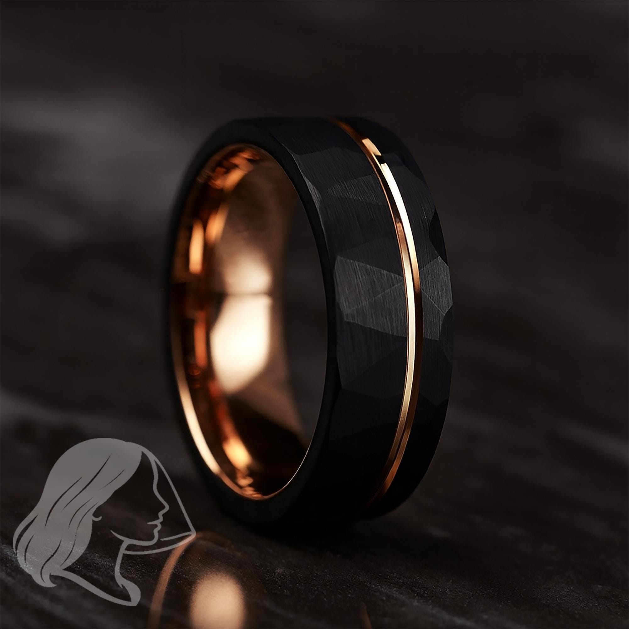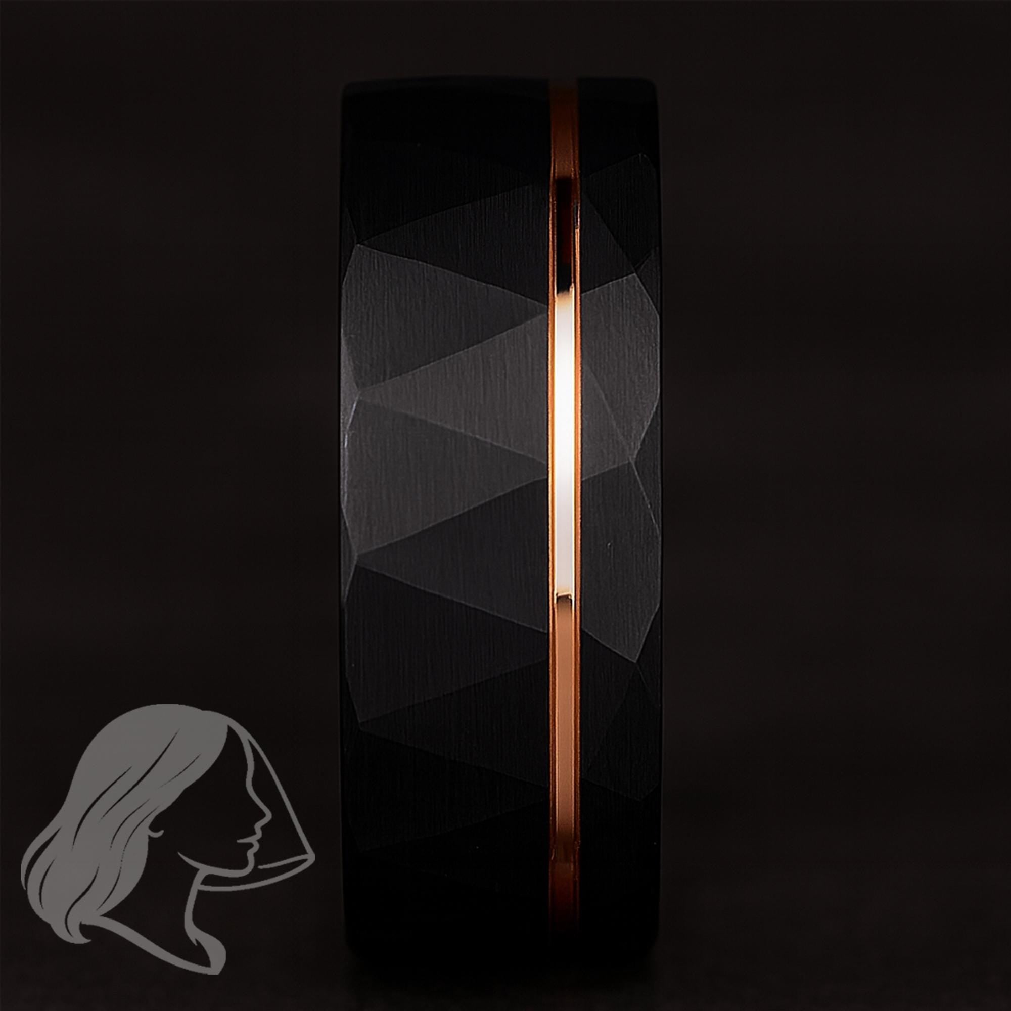 Black & Rose Gold Wedding Band, Hammered Black Tungsten Ring, 18K Rose Gold Tungsten Wedding Band, Offset Gold Line Accent Ring - 8mm Wide