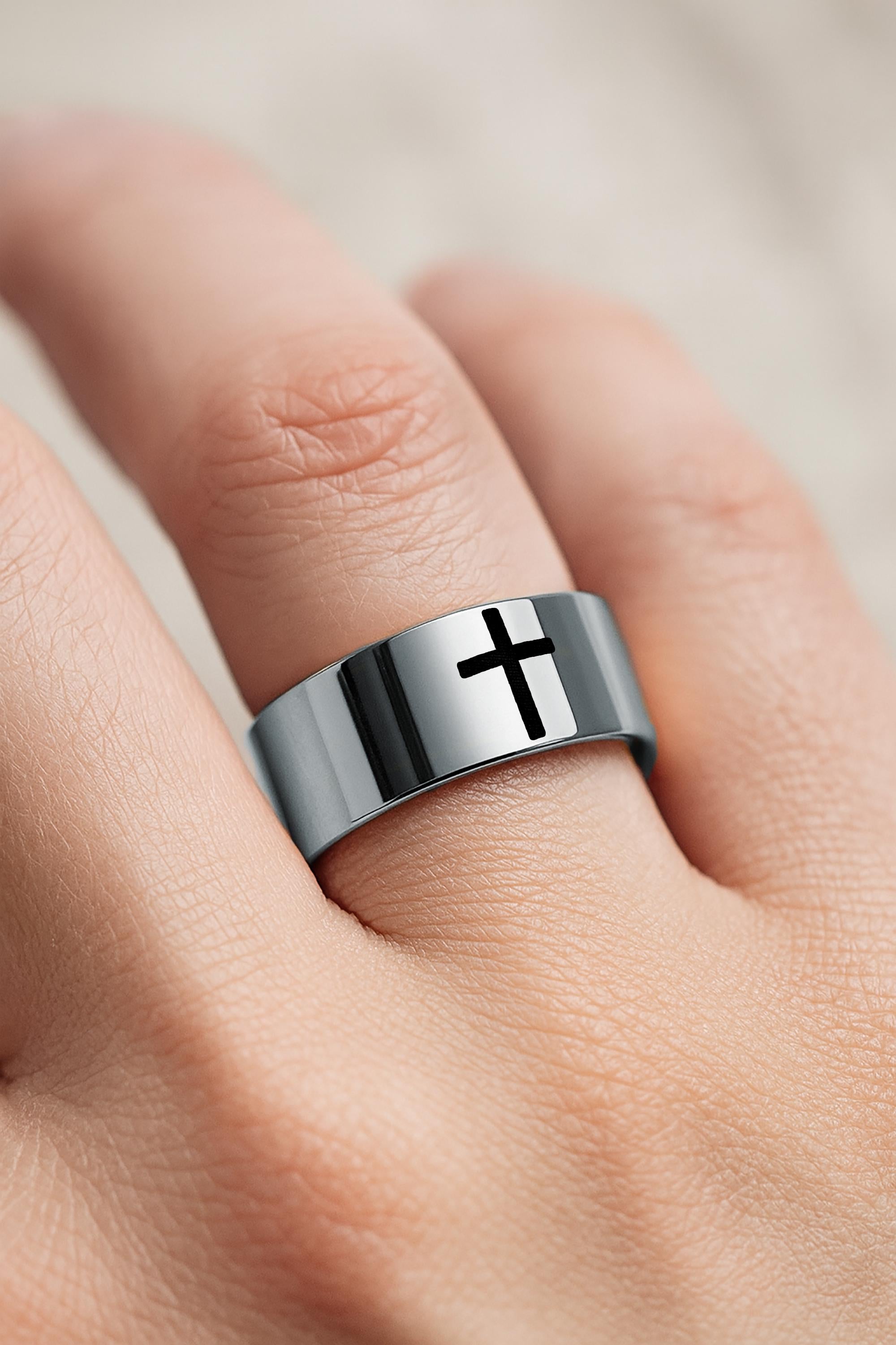 Engraved Black Cross Ring, Extra Wide Silver Tungsten Cross Band, Silver Cross Ring, Silver Cross jewelry, Mens Extra Wide Ring - 10mm Wide