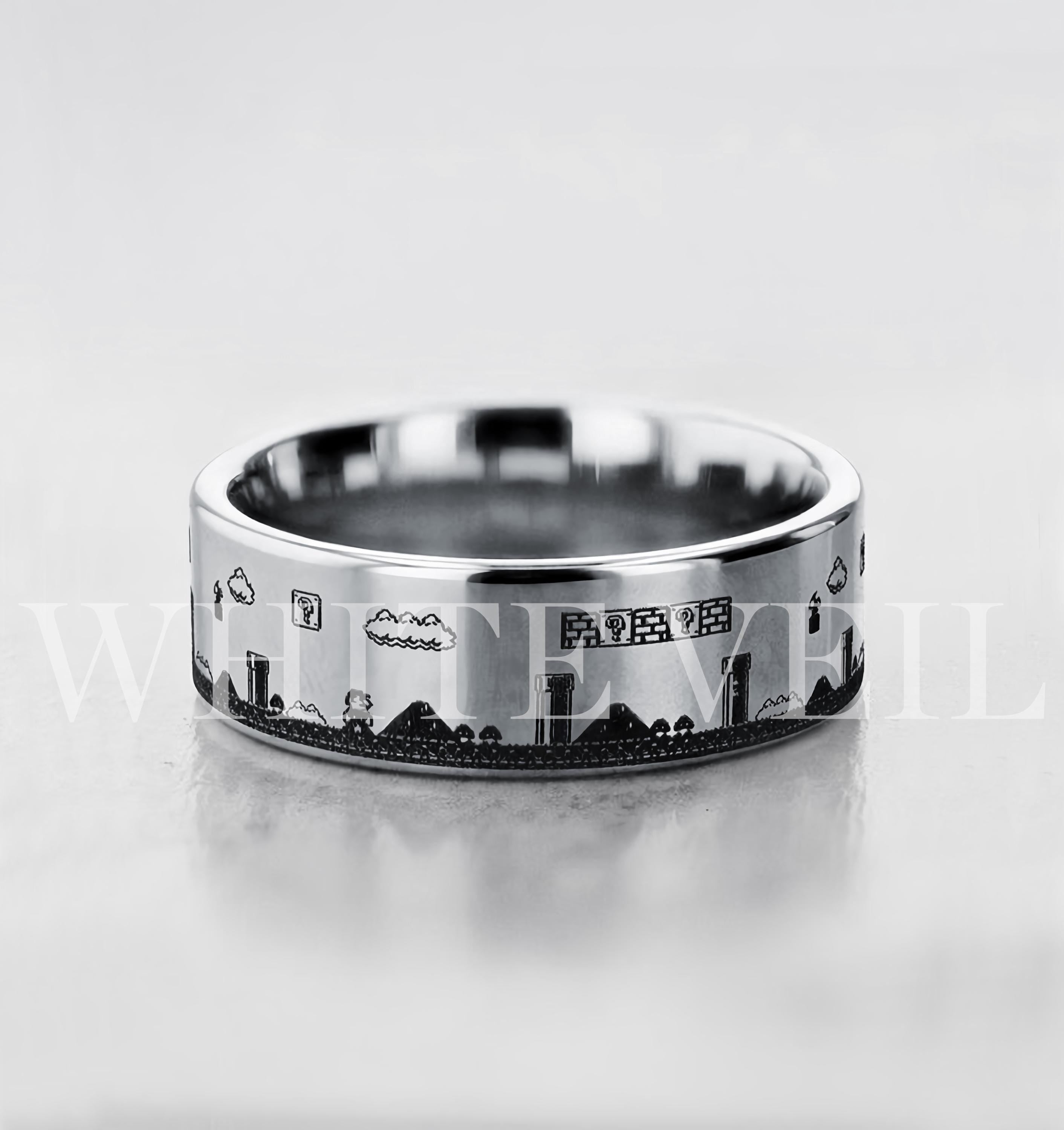 Engraved Mario Ring, Gamer Wedding Ring, Fan-inspired Ring, Retro Band, Game Level Tungsten Carbide - 8mm Wide & Multiple Colors Available