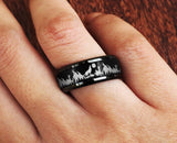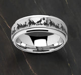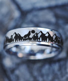 Gravierter Bergwolf, der den Mond anheult, viele Berge, Landschaftsring, Spinner-Angstring, satiniert und polierte Kanten, 8 mm erhältlich