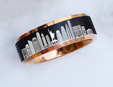 Dies ist ein wunderschöner klassischer Ring mit flacher und abgeschrägter Kante, in den die berühmte Skyline-Silhouette von New York eingraviert ist :]