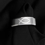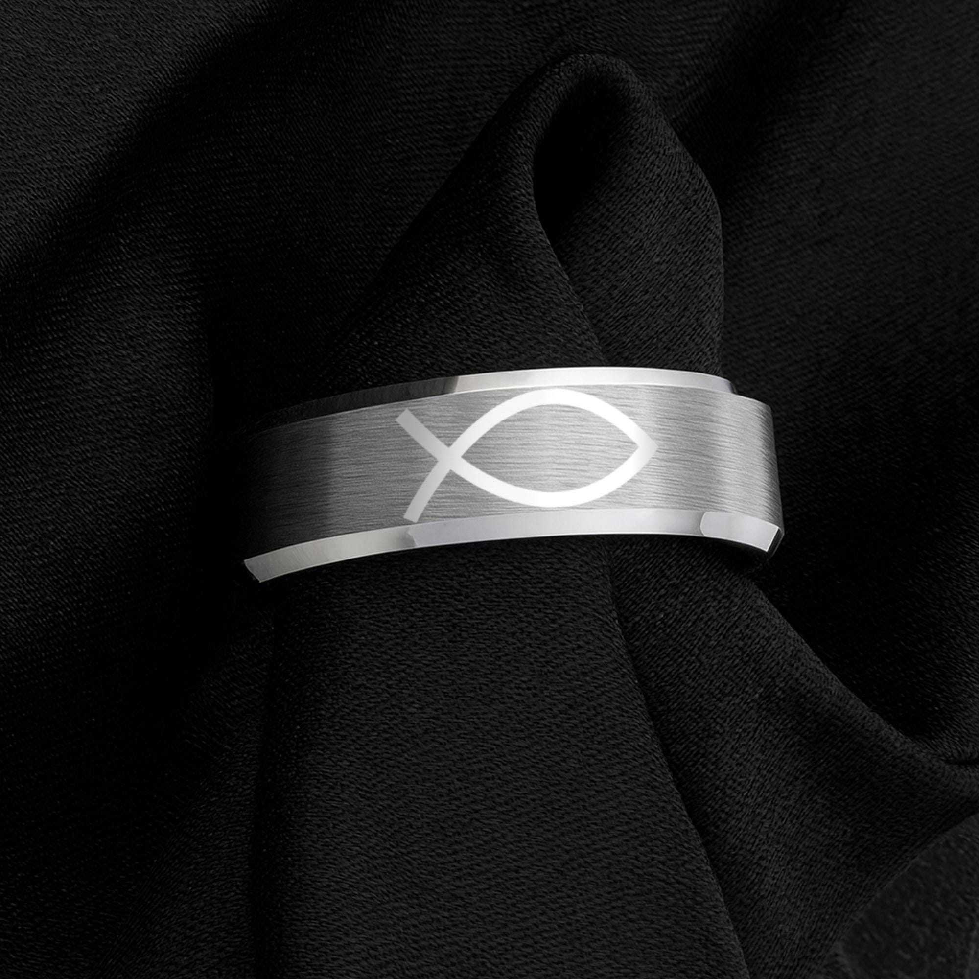 This tungsten carbide ring features the Ichthys, or Jesus Fish, an enduring Christian symbol of faith and devotion. The brushed silver center with polished beveled edges gives it a sleek and timeless look. Scratch-resistant and highly durable, it’s the perfect choice for a Christian wedding band, promise ring, or daily expression of faith.