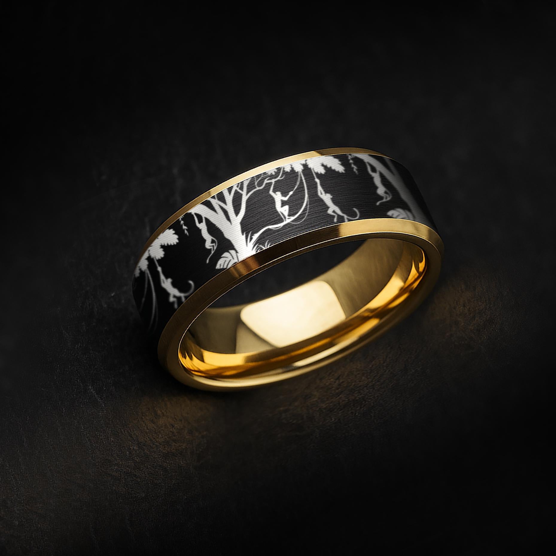 This tungsten ring features a beautifully detailed engraving of monkeys swinging through a tropical forest. The black brushed center contrasts elegantly with gold beveled edges, symbolizing playfulness and adventure. A perfect piece for nature lovers, explorers, and anyone who appreciates unique wildlife-inspired jewelry.