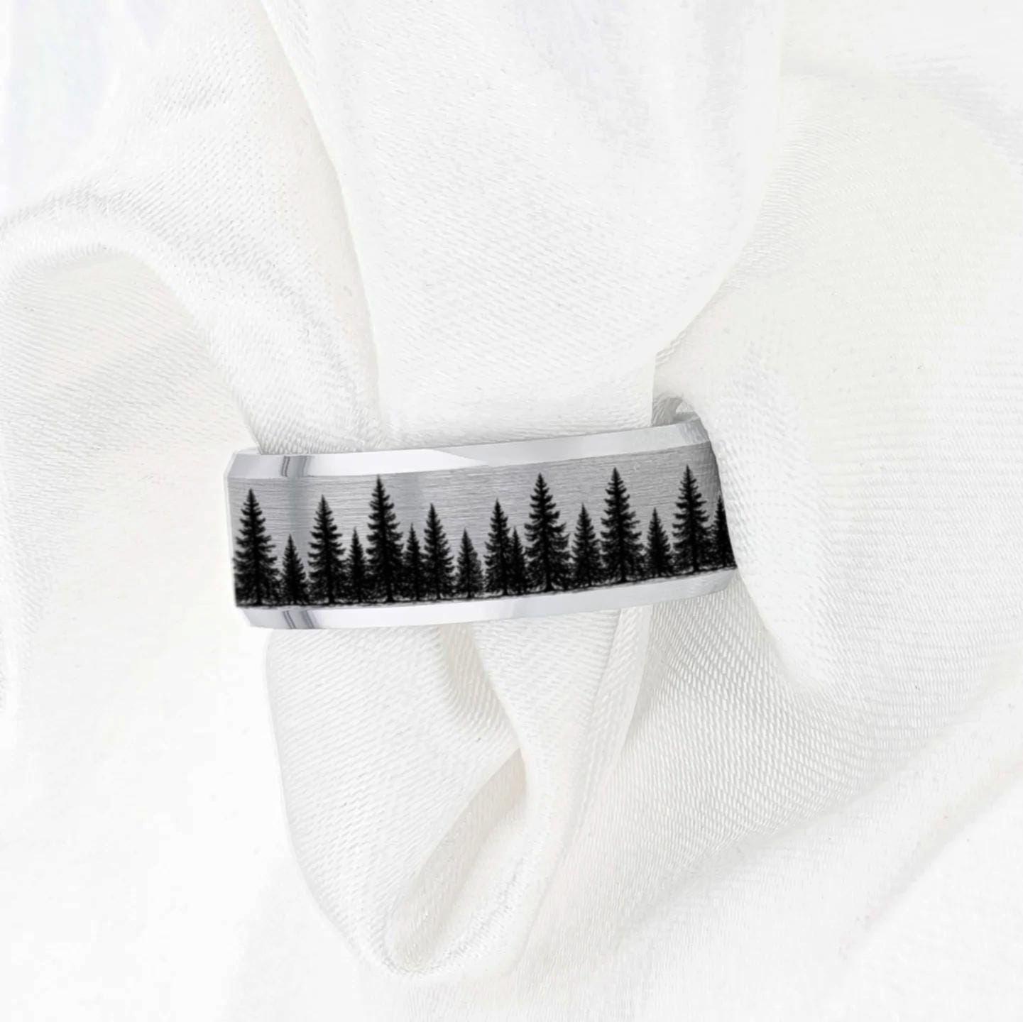 Fir Tree Forest Ring - Silver Tungsten Ring, Black Fir Tree Engraved Mens Wedding Ring, Unique Nature Wedding Band, 8mm Wide, Comfort Fit