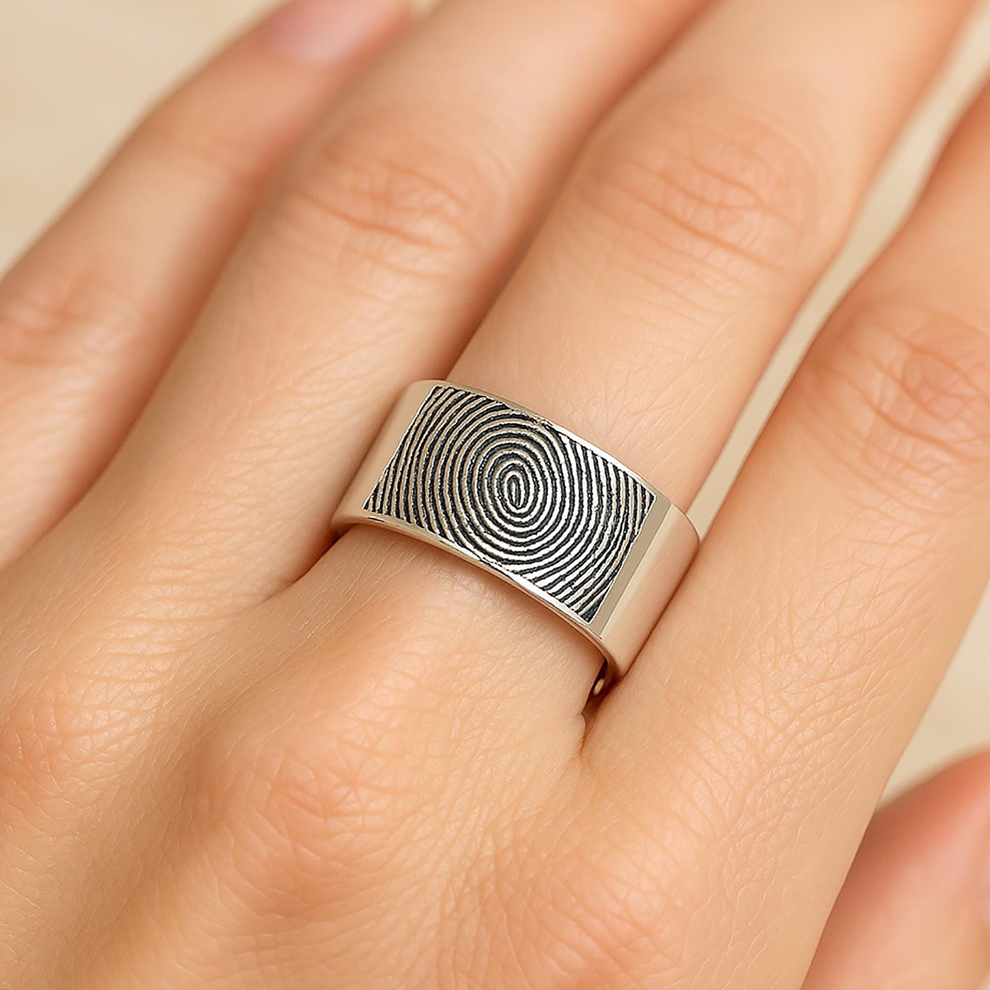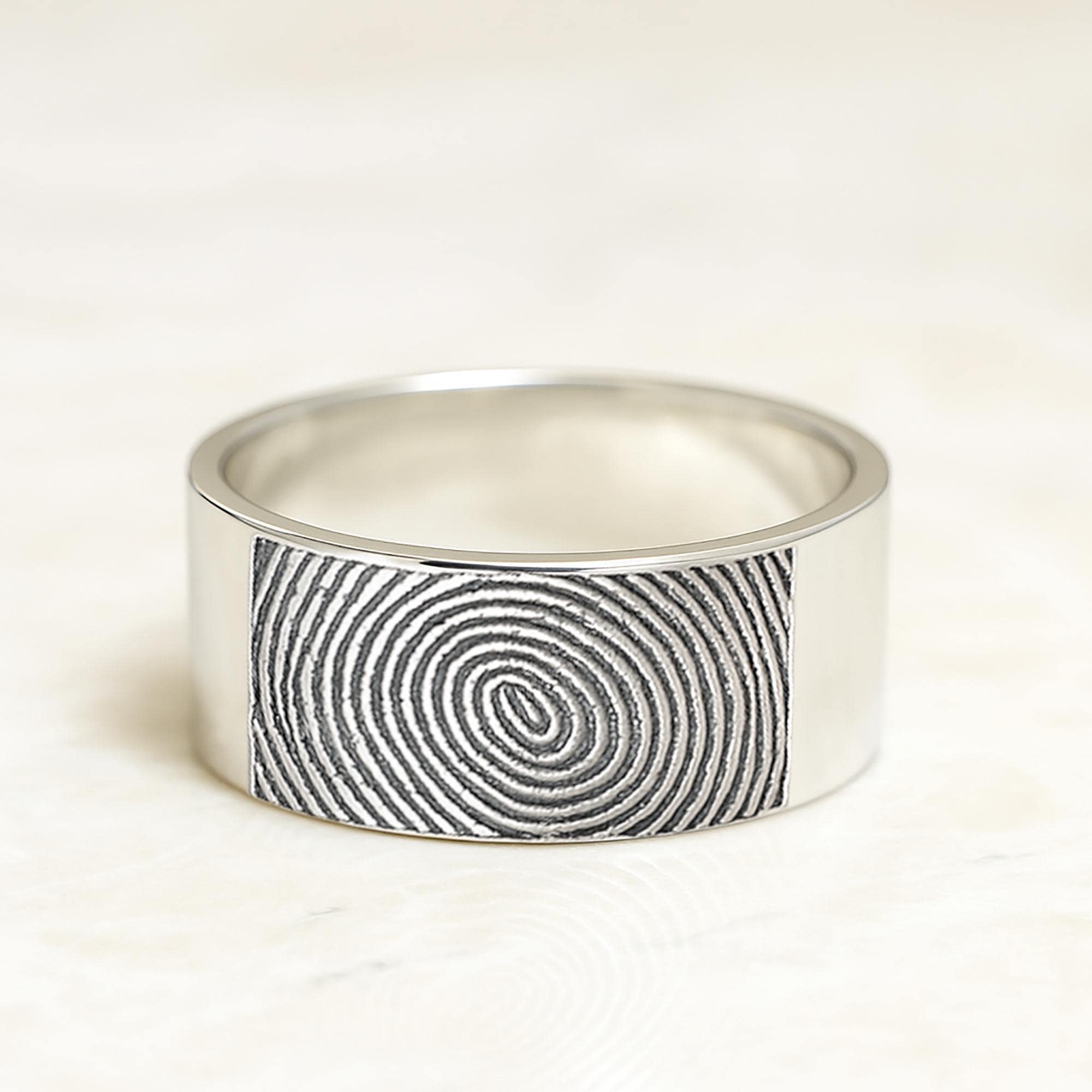 Extra Wide Engraved Square Fingerprint Ring, Extra Wide Fingerprint Ring, Flat Polished Silver Tungsten Carbide Band, Real Print Ring -10mm