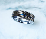 This is a beautiful one of a kind mens wedding ring with thin blue line flags going around the entire ring.