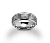 This spinner ring has an engraved raised satin brushed center and polished edges. The satin brushed center spins 360 degrees while the polished edges stay fixed on your finger. The satin center has a beautiful circuit board engraving around the entire ring. The design is repeated and may vary depending on size of the ring.